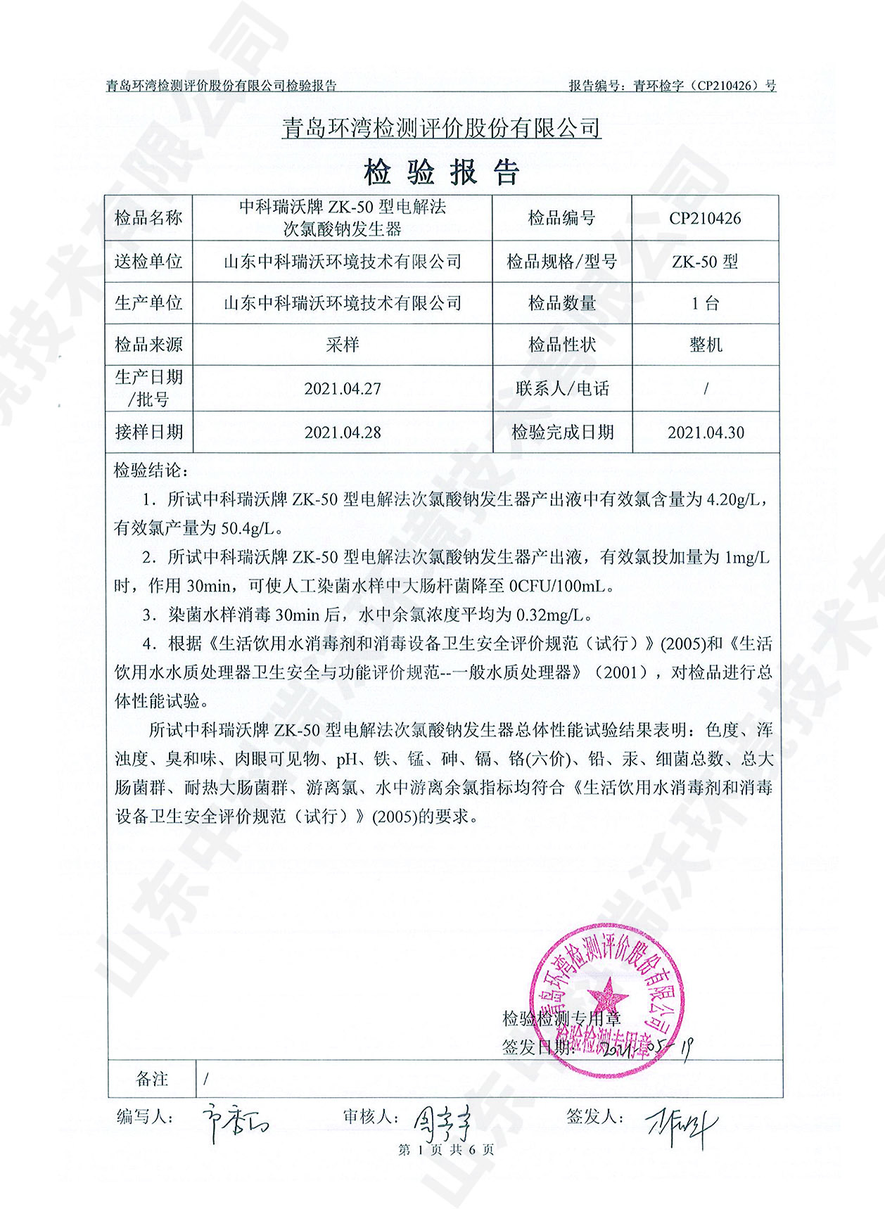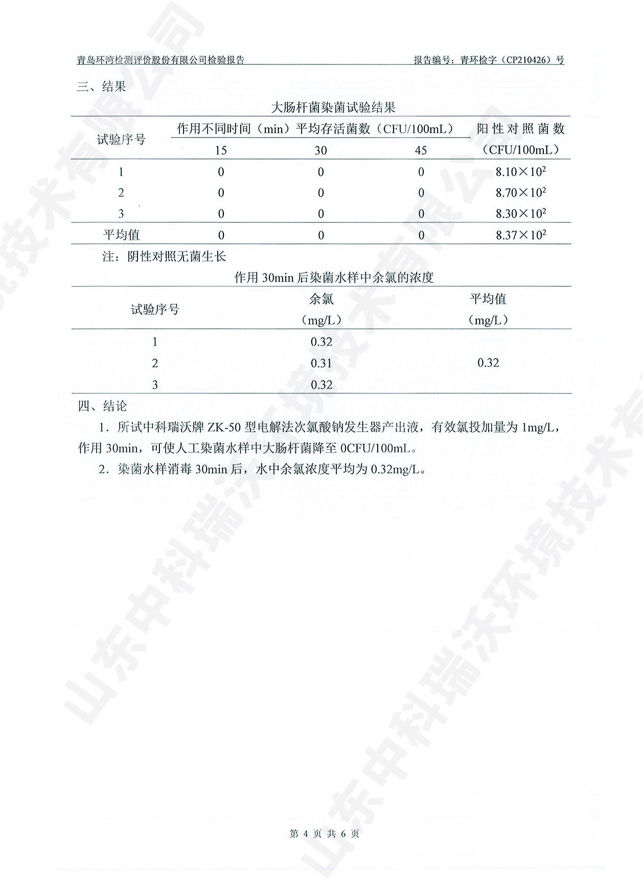 飲水消毒設備檢測報告~次氯酸鈉消毒
